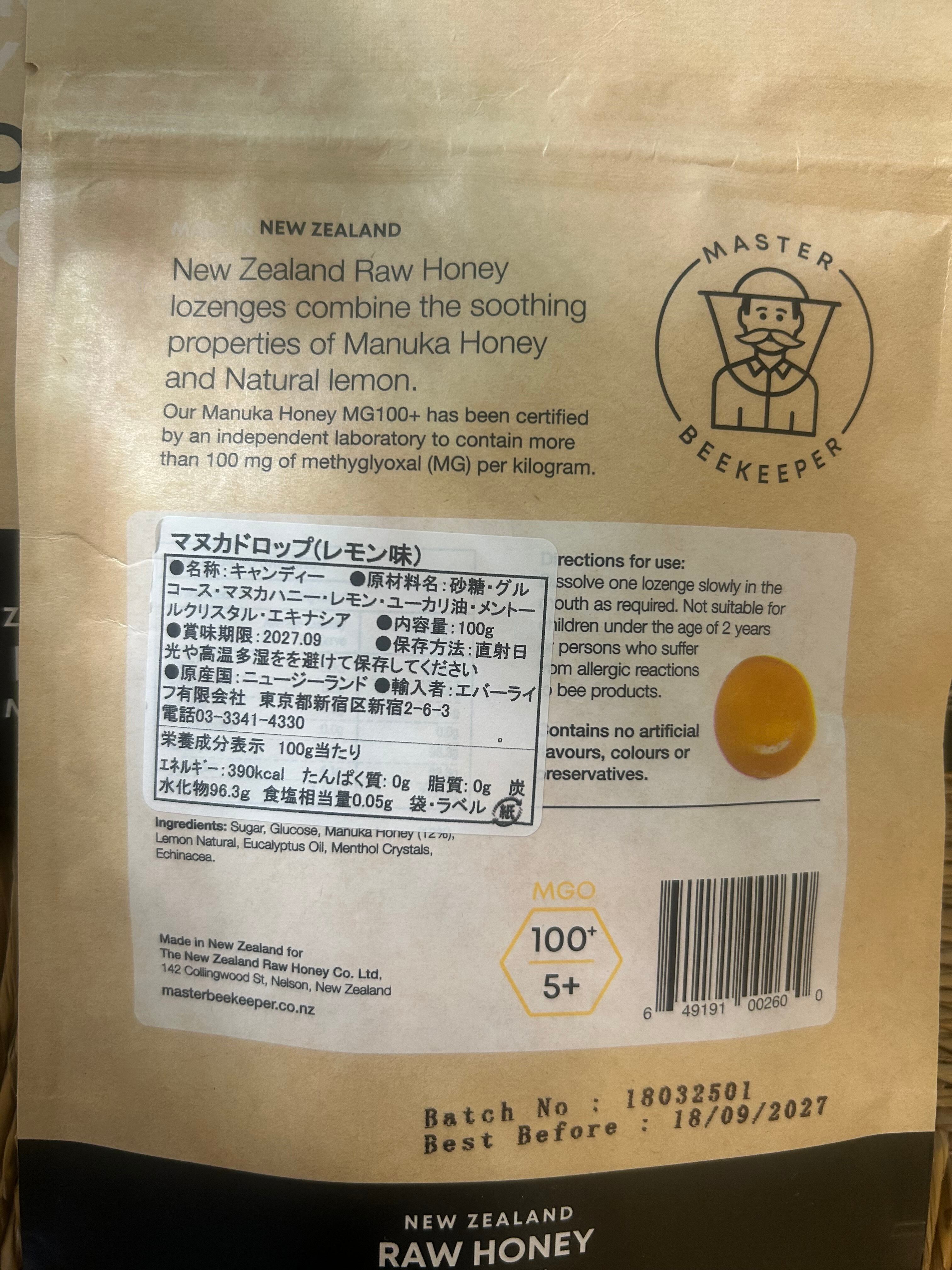 原材料:砂糖、グルコース、マヌカハニー、レモン、ユーカリ油、メントールクリスタル、エキナセア
