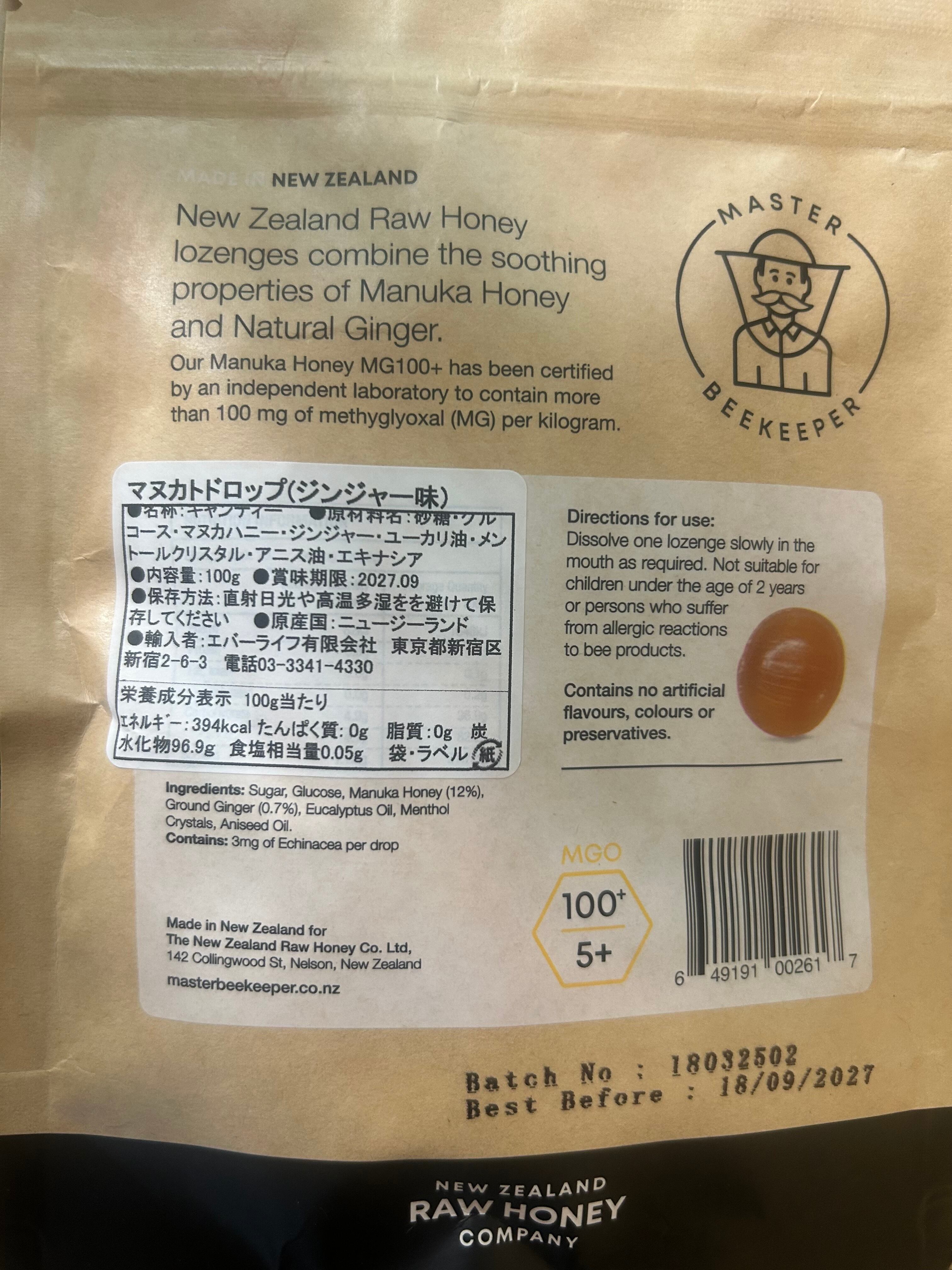 原材料:砂糖、グルコース、マヌカハニー、レモン、ユーカリ油、メントールクリスタル、エキナセア