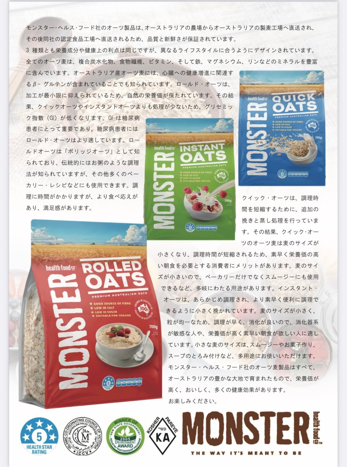 モンスター・ヘルス・フード社のオーツ製品は、オーストラリアの農場からオーストラリアの製工場へ直送され、